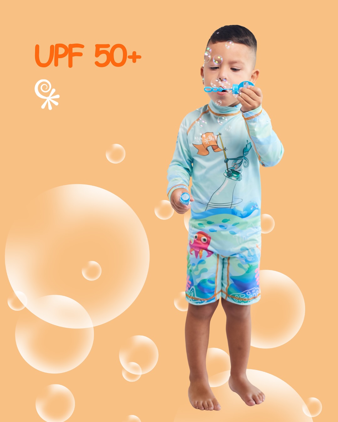 Equipamos cada aventura acuática con protección solar certificada UPF 50+ y diseños eco sostenibles. Rashguards, enterizos, gorros y accesorios que bloquean el 98% de rayos UV mientras inspiran valores positivos en los más pequeños.
