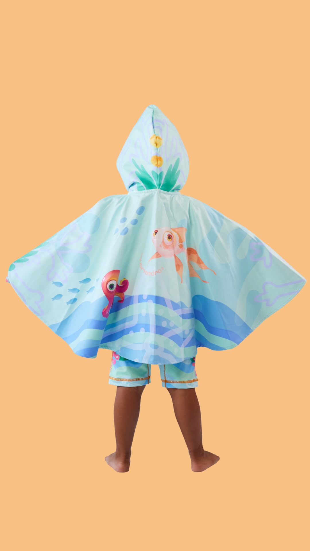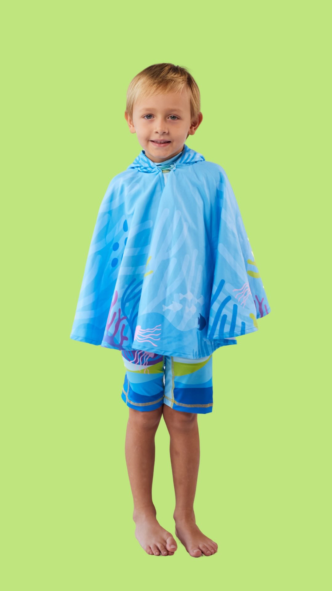 Secado extra rápido y protección solar continua post-baño. Capucha bicolor envolvente y 90% materiales reciclados certificados.