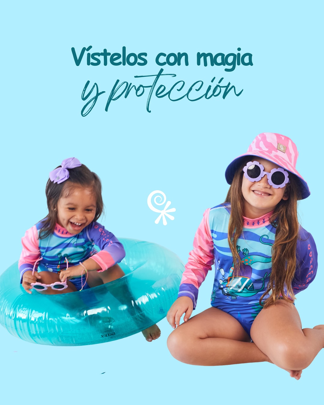 Elegancia playera con protección UV certificada. Diseños vibrantes que resisten cloro y sal, para niñas que aman el agua y el estilo.