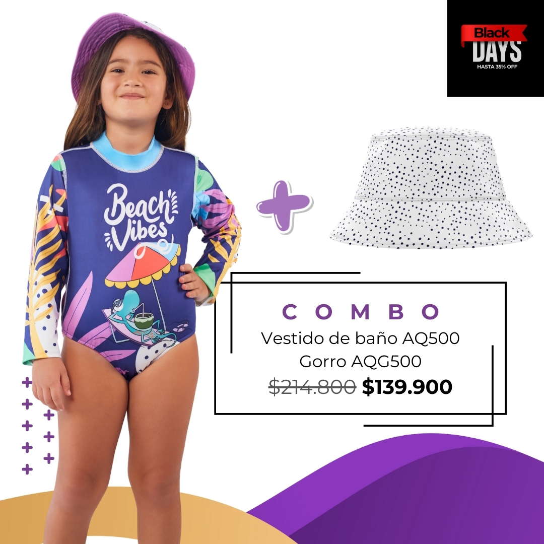 Combo: Traje de Baño Enterizo Niña AQ500+ Gorro Antisolar AQG500