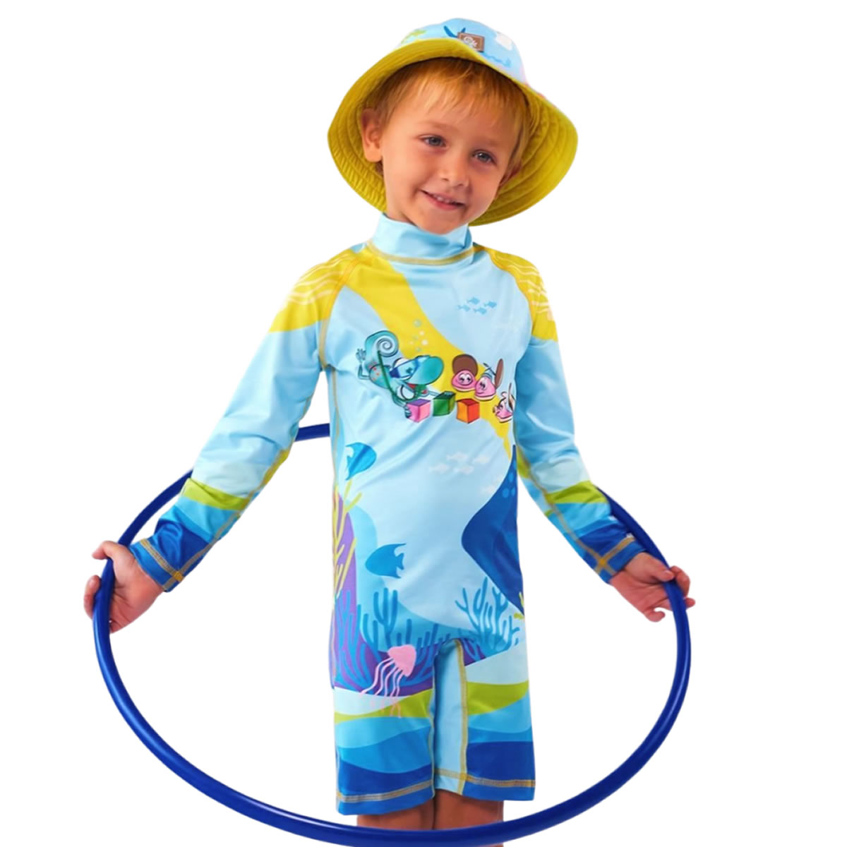 Enterizo Sun Suit UPF 50+ para bebés y niños con protección solar total. Tela eco sostenible ultrasuave, cobertura completa y diseños vibrantes para playa y piscina.