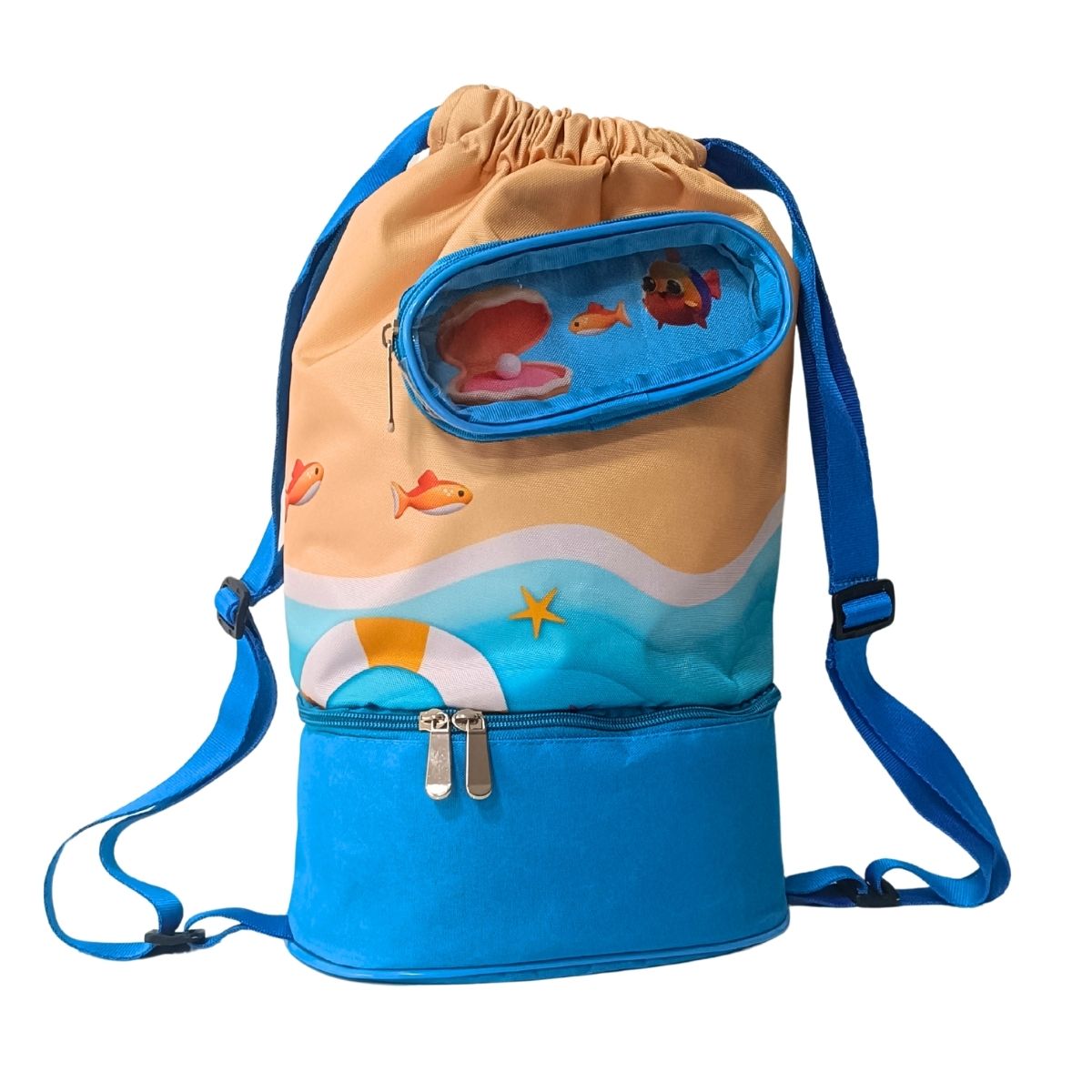 Morral playero infantil diseñado para aventuras acuáticas. Con 3 compartimientos inteligentes: inferior para zapatos o lonchera, bolsillo transparente exterior para gafas y bloqueador, y compartimiento plegable interno para toallas y juguetes. Elaborado en poliéster y nylon resistente, liviano y fácil de limpiar. Medidas 38x27x23cm. Disponible en 6 diseños exclusivos con Aquamandra, pulpos y fauna marina. Ideal para playa, piscina y días de campo. El compañero perfecto para niños curiosos y padres prácticos.
