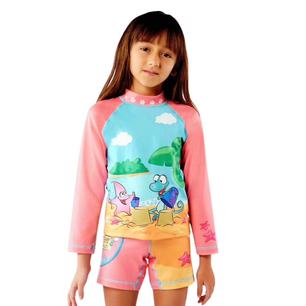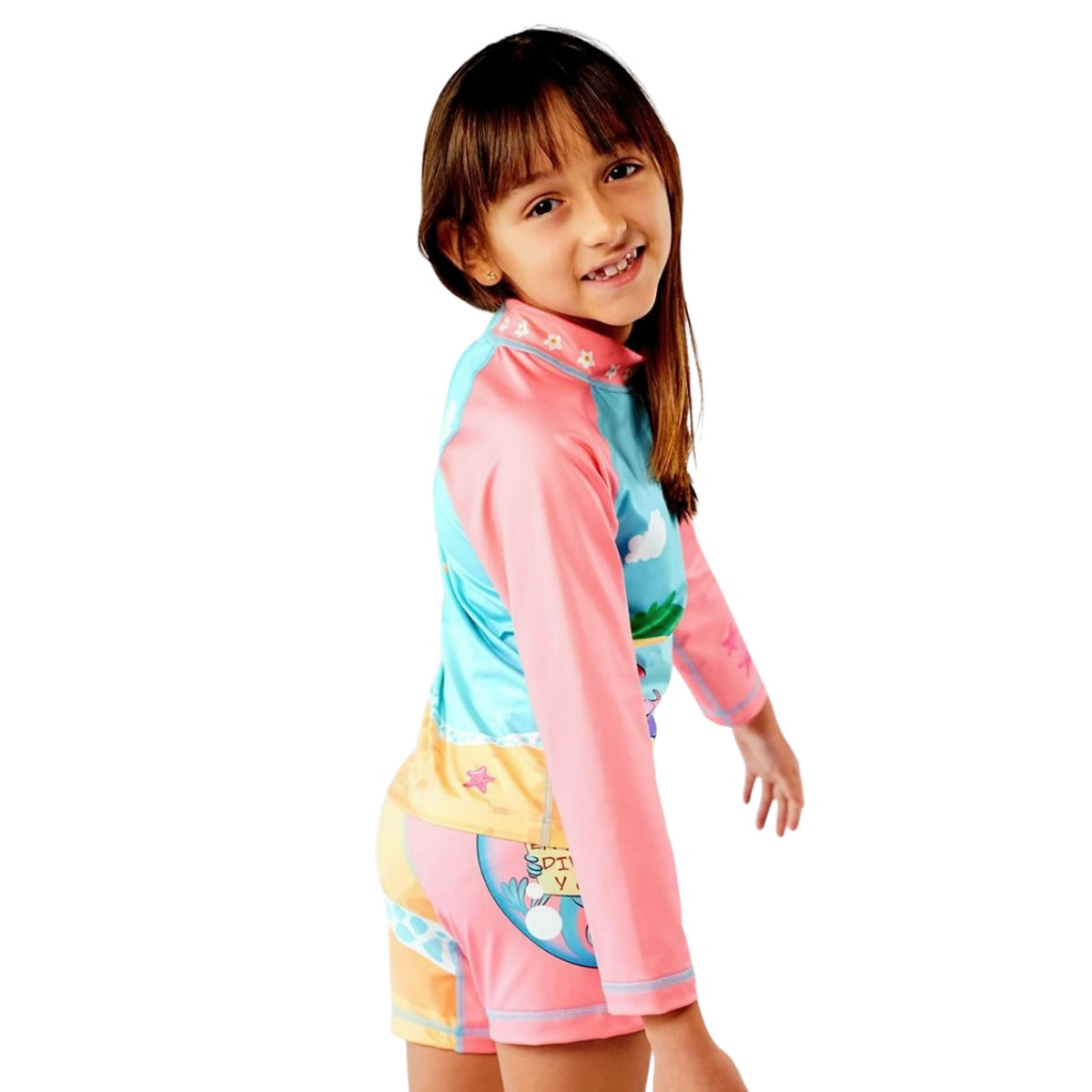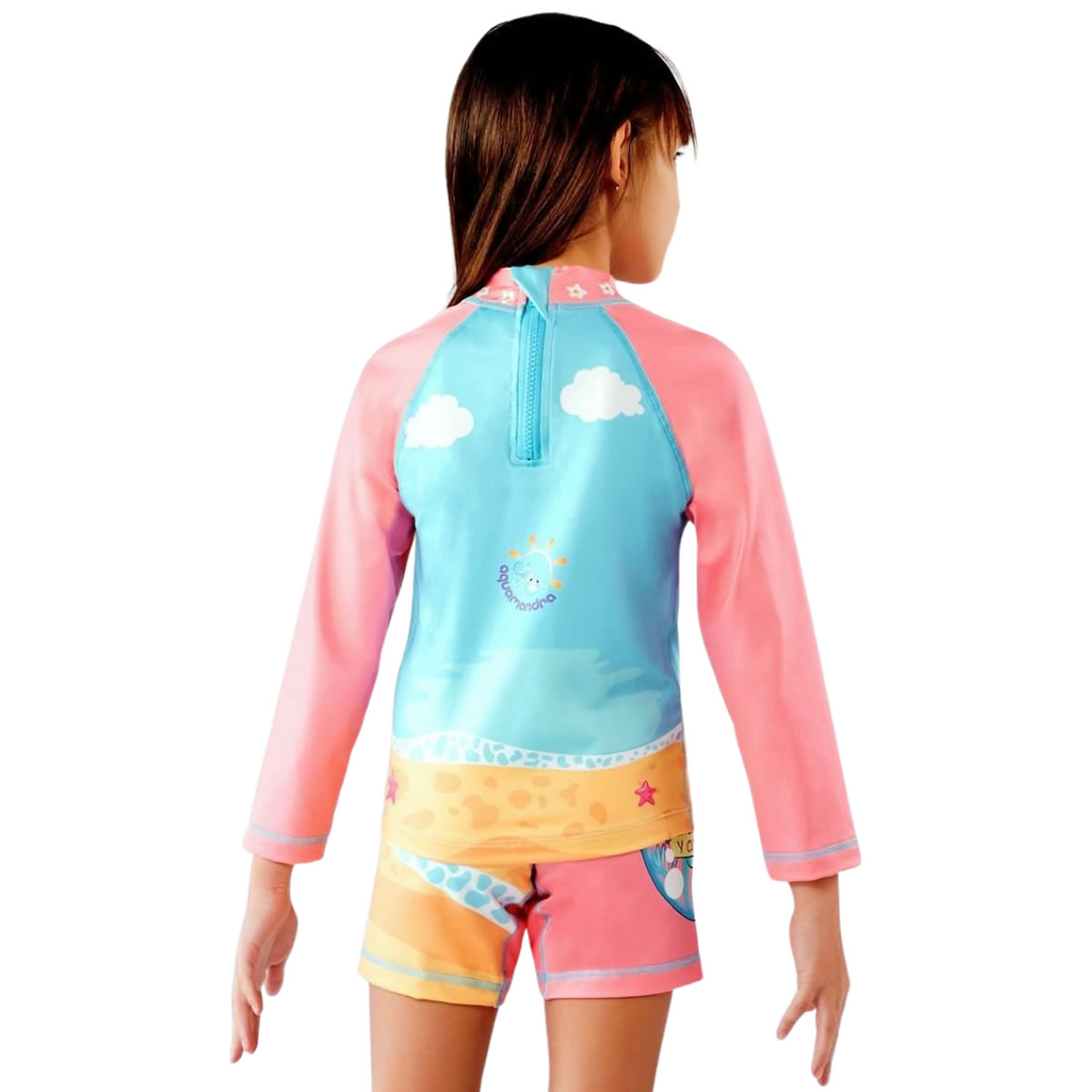 Set Rash Guard y Short Niña con UPF 50+ Aquamandra Castillo de Arena Palo de Rosa / Azul Cielo – AQ101