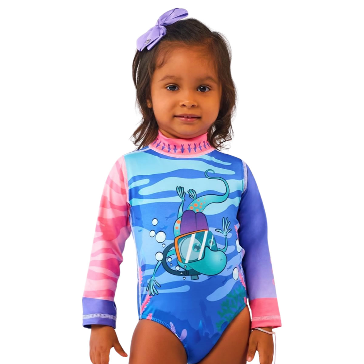 Traje de Baño Enterizo Niña con UPF 50+ Aquamandra Buceando Lila / Rosa – AQ501