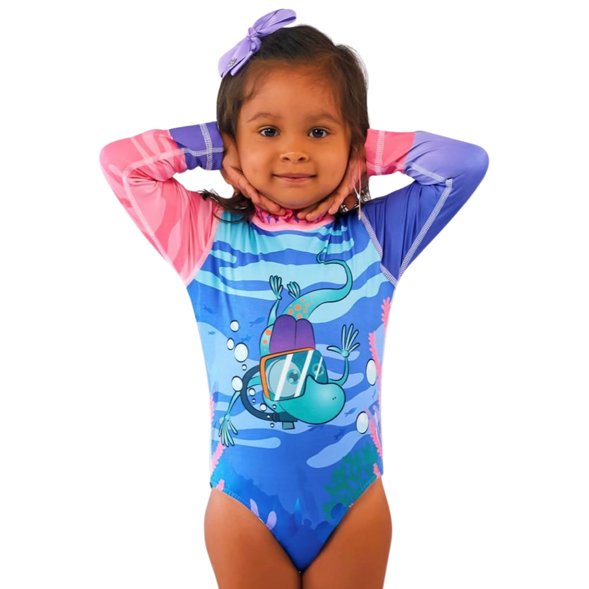 Traje de baño una pieza UPF 50+ para niñas con manga larga y protección solar total. Tela eco sostenible, diseño vibrante y máxima comodidad para playa y piscina.